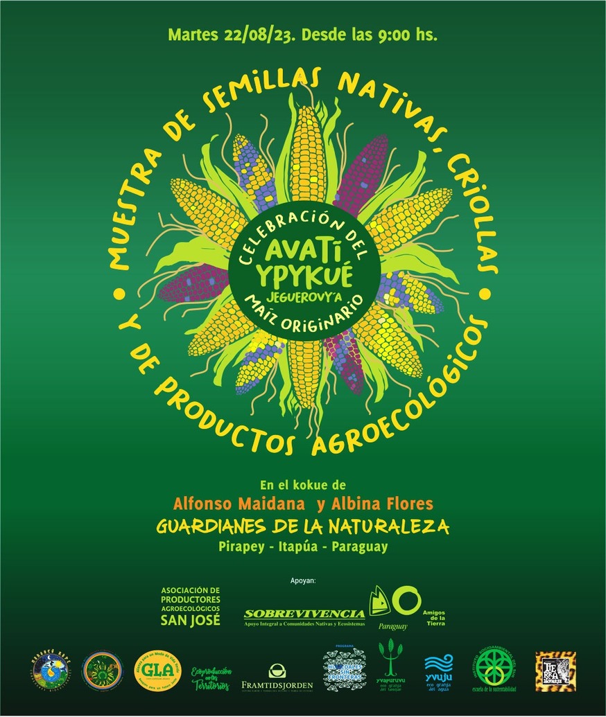 La Fiesta del AVATÍ YPYKUE - MAÍZ ORIGINARIO y de las Semillas Nativas y Criollas, celebrada anualmente en la Finca de Don Alfonso y Albina Maidana en Pirapey 57 2da. linea, Edelira, Departamento de Itapúa, es un espacio de encuentro y participación de las familias ECOproductoras, en el que se desarrolla el necesario diálogo de saberes y haceres con la población participante de la comunidad y de otras organizaciones sociales sobre la importancia de nuestro patrimonio genético , la base fundamental para la soberanía y seguridad alimentaria de nuestros pueblos. Se convoca e integra a diversos actores nacionales, organizaciones de ECOproductores familiares, agroecológicos, investigadores y docentes vinculados a la biodiversidad, al rescate de las semillas nativas y criollas y a la restauración de los ecosistemas. También participan y apoyan esta importante iniciativa, organizaciones ecologistas comprometidas con nuestros bienes comunes de la naturaleza, con los derechos fundamentales humanos y de la naturaleza, la agroecología y la agricultura ecológica familiar campesina.