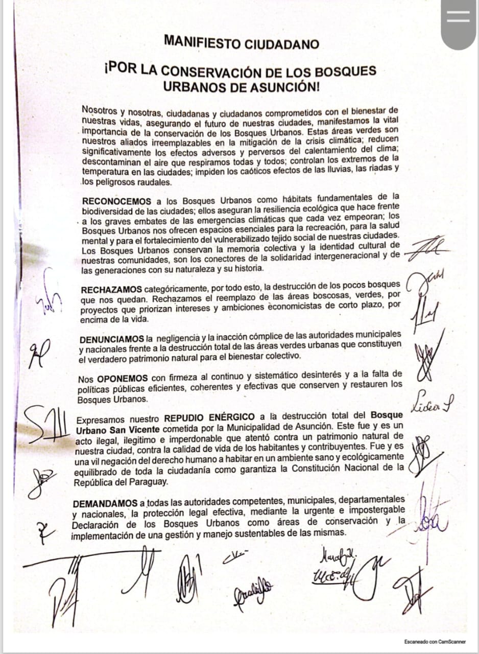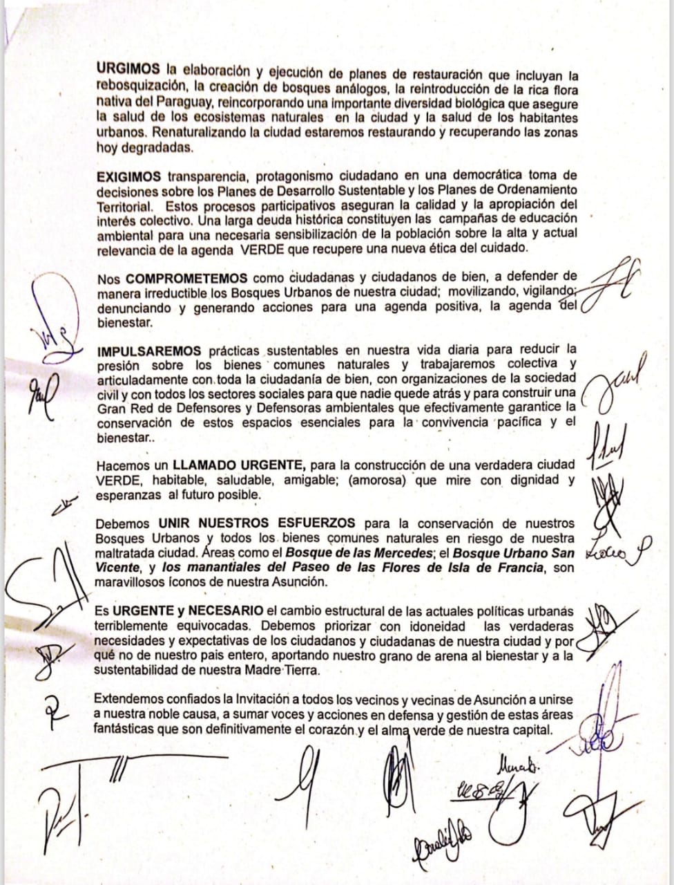 - El repudio enérgico a la destrucción total del Bosque Urbano San Vicente cometida por la Municipalidad de Asunción, considerado un acto ilegal e ilegítimo que atenta contra los derechos ambientales y sociales de la población.